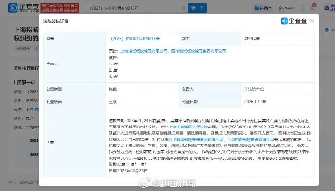 据封面新闻消息,企查查APP显示,1月8日,法院刊登海底捞小便当事人及其父母道歉声明。唐某表示“我深刻认识到自己的错误行为,在此向四川新派餐饮管理集团有限公司、上海捞派餐饮管理有限公司表示真诚的歉意。我也接受到了来自家长、学校、公安、法院,以及网络广大消费者的批评与教育,我会吸取深刻的教训,改过自新。长大后,我要努力成为一位对家庭,对国家,对社会有担当的人。”