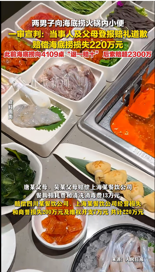 据此前报道,该案中,法院判令两名未成年人及其监护人向海底捞公司公开赔礼道歉,监护人赔偿海底捞公司经济损失220万元。