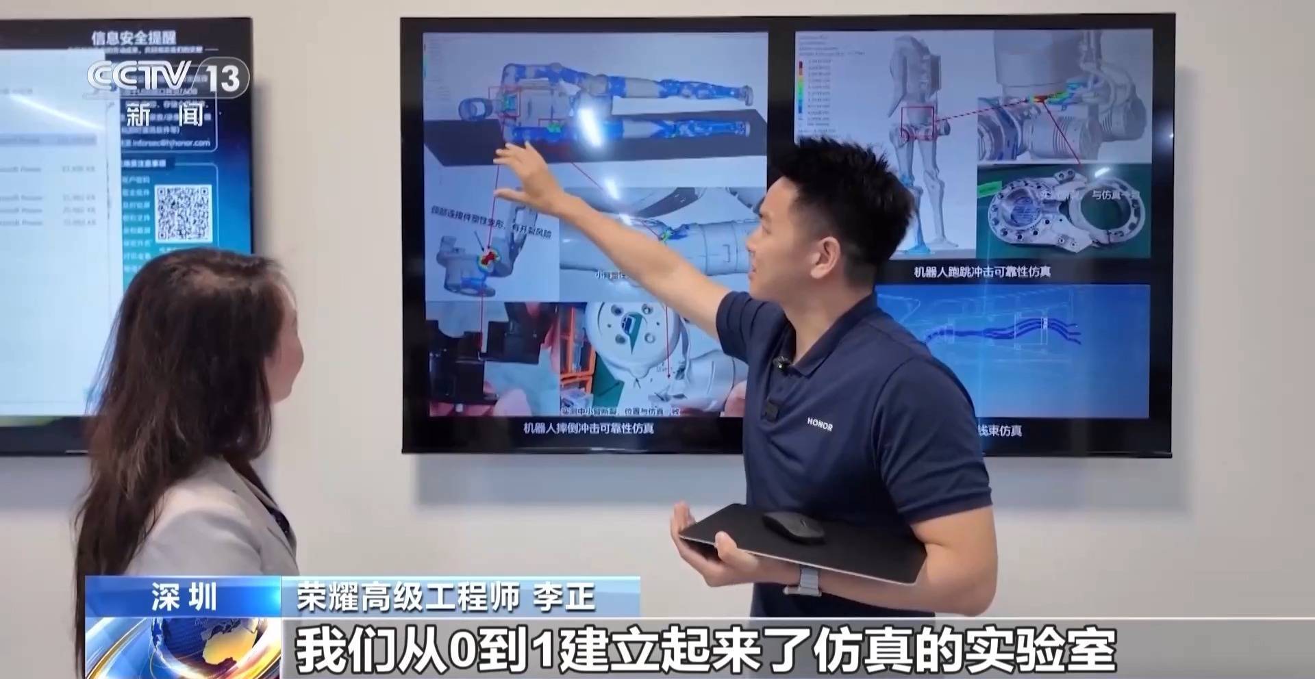 荣耀高级工程师 李正:我们从0到1建立起来了仿真的实验室,一个机器人它的整个方案我要进行数字化,把它放到计算机里边。我们有自己的材料库,每一个部件,它的材料在不同的环境下、不同的速度下,它的力、热、化学,它的性能全部都有。我们大概积累了1000多种材料,比如它颈部有风险的时候,我只要换一下代号,从001换到002就好了。小臂的一个塑形断裂风险,我们在实验室里就已经测出来了。通过仿真,只需要1天的时间,就可以换10种不同的方案平行计算,再去开模,再在实验室里去验证。